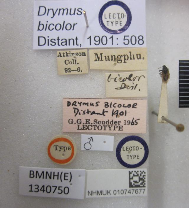 Drymus bicolor. Lectotype. (BMNH) - (CC BY-NC 4.0) Photo by Stuart Cole, reproduced with permission from the Natural History Museum, London, UK.