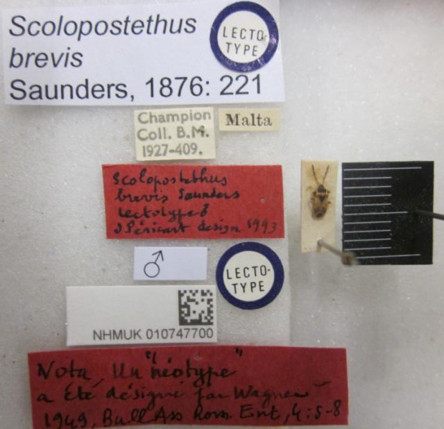 Scolopostethus brevis. Lectotype. (BMNH) - (CC BY-NC 4.0) Photo by Stuart Cole, reproduced with permission from the Natural History Museum, London, UK.